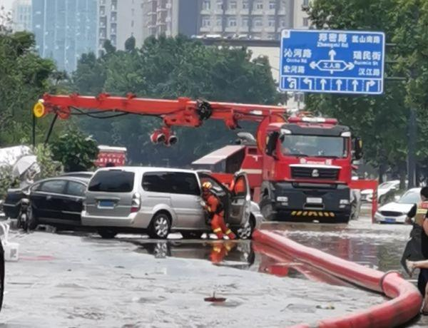 江蘇消防救援隊在中原區航海路桐柏路交叉口用遠程供水系統抽水。 截至7月21日19時(shí),救援隊伍先后在20個(gè)內澇嚴重地點(diǎn)開(kāi)展排澇作業(yè),在阜外華中心血管醫院開(kāi)展病人轉運作業(yè),共出動(dòng)指戰員360人次,車(chē)輛85輛次,排水4.32萬(wàn)噸,疏散群眾28人,轉移物資36.7噸。